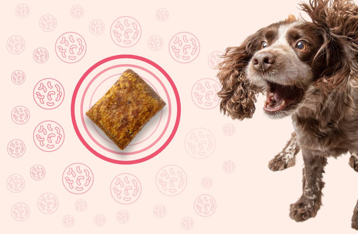 "Rio rutschte auf dem Hintern und hatte weichen Stuhl, Oli leckte seine Pfoten und fraß Gras. Probiotika, Präbiotika und Postbiotika in leckeren Snacks reduzieren Verdauungsprobleme bei Hunden."