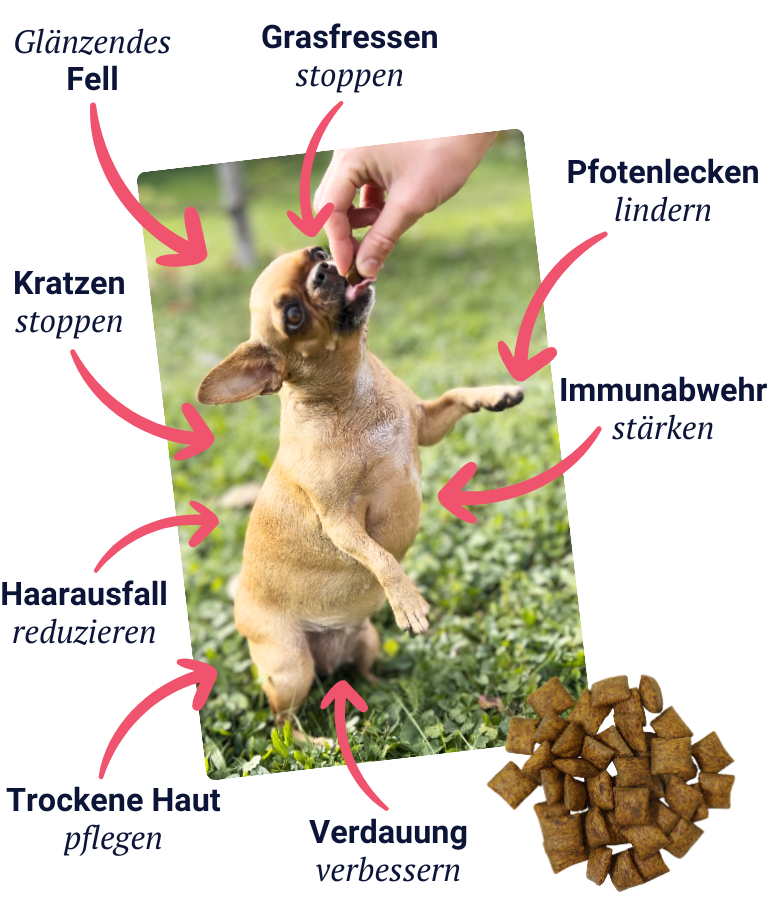 Daher ist dies der ideale Snack für Tiere, die unter Beschwerden wie Juckreiz, Kratzen, Pfotenlecken, Hautentzündungen oder Verdauungsproblemen leiden."