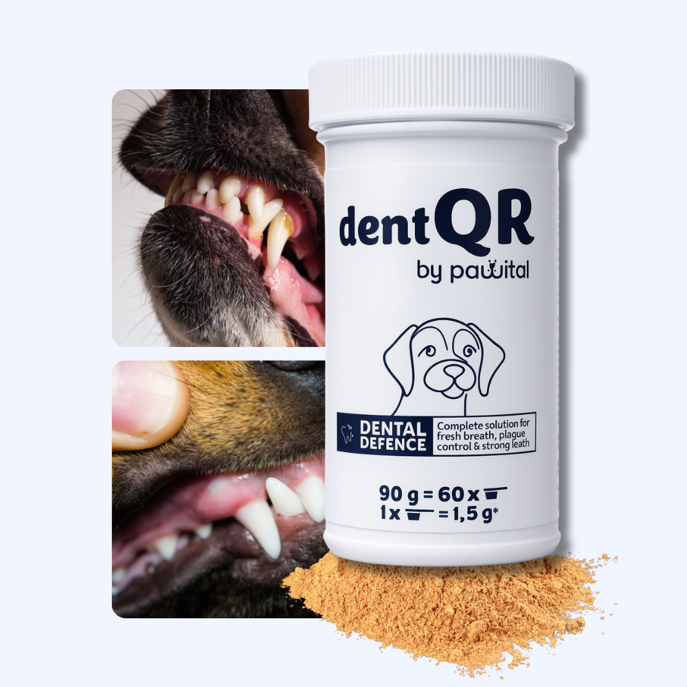dentQR ist ein tägliches Zahnpflege-Pulver, das dabei hilft, Plaque und Zahnstein bei Ihrem Hund zu reduzieren, den Atem zu erfrischen und die Zahnfleischgesundheit sowie ein ausgeglichenes orales Mikrobiom zu unterstützen. Einfach unters Futter mischen.